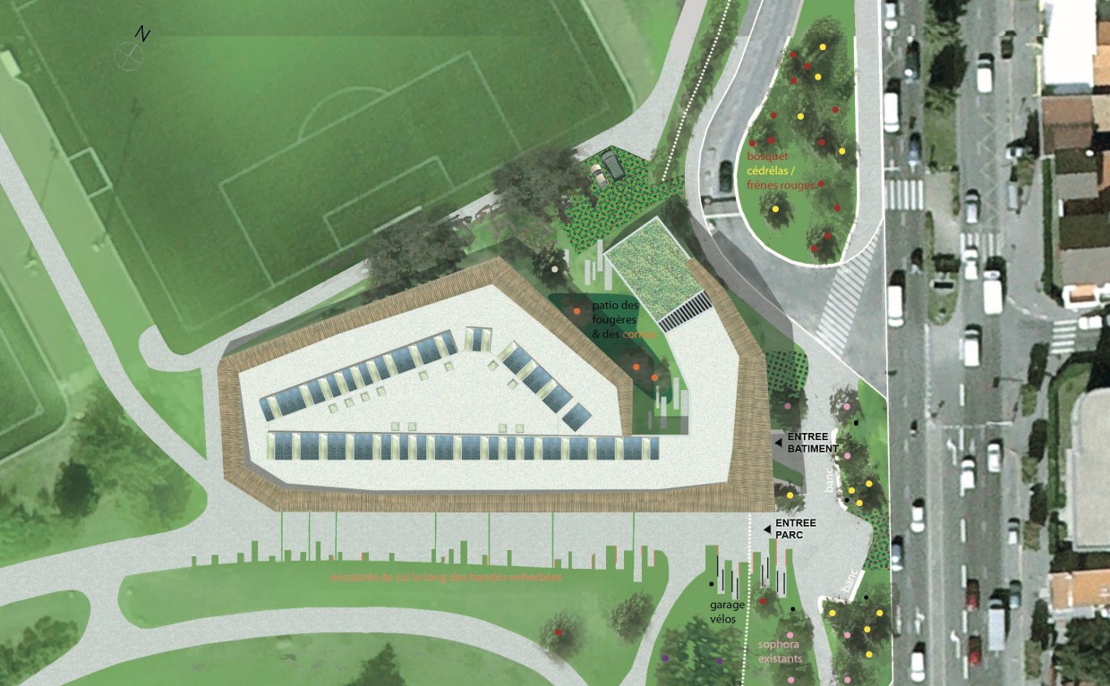 Le parti pris a été de créer une enveloppe en bois recouvrant le bâtiment d’une peau permettant une intégration parfaite au site boisé.