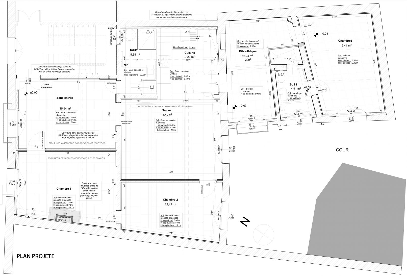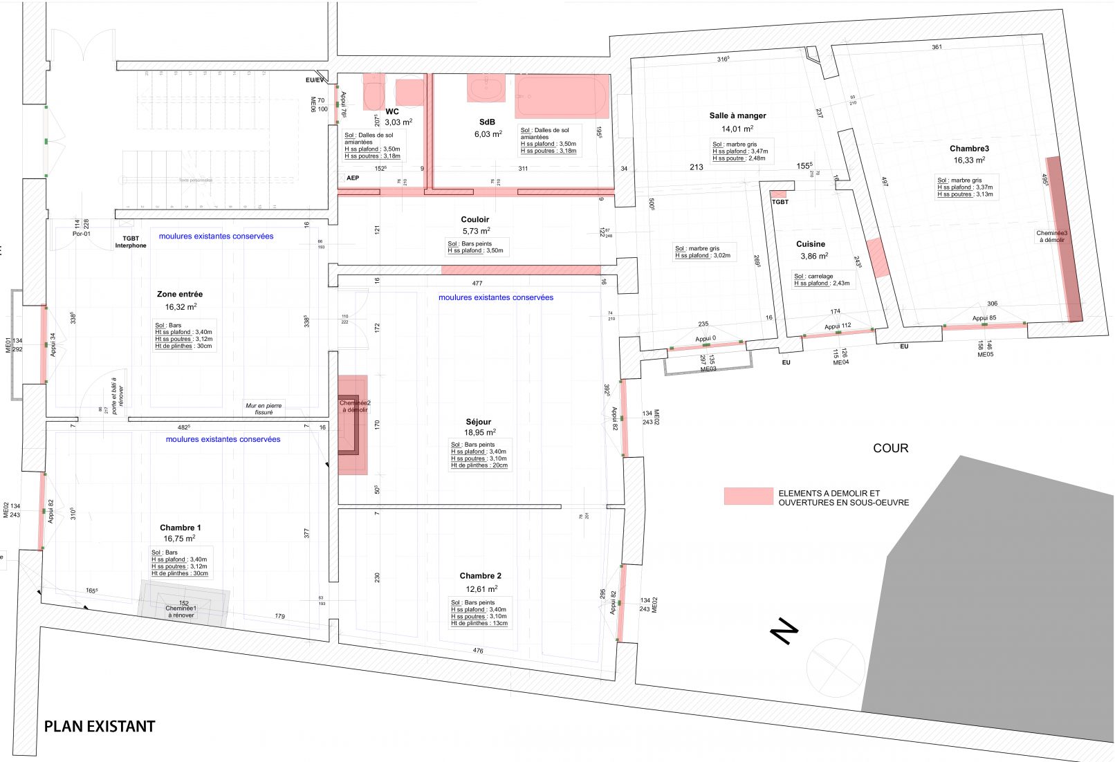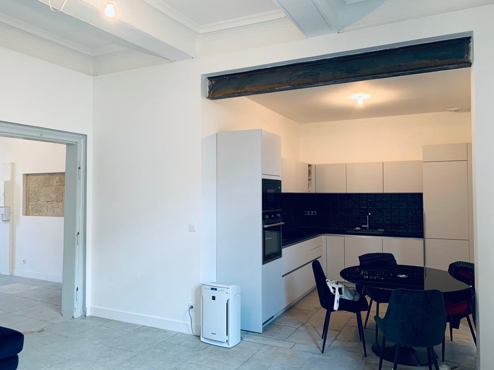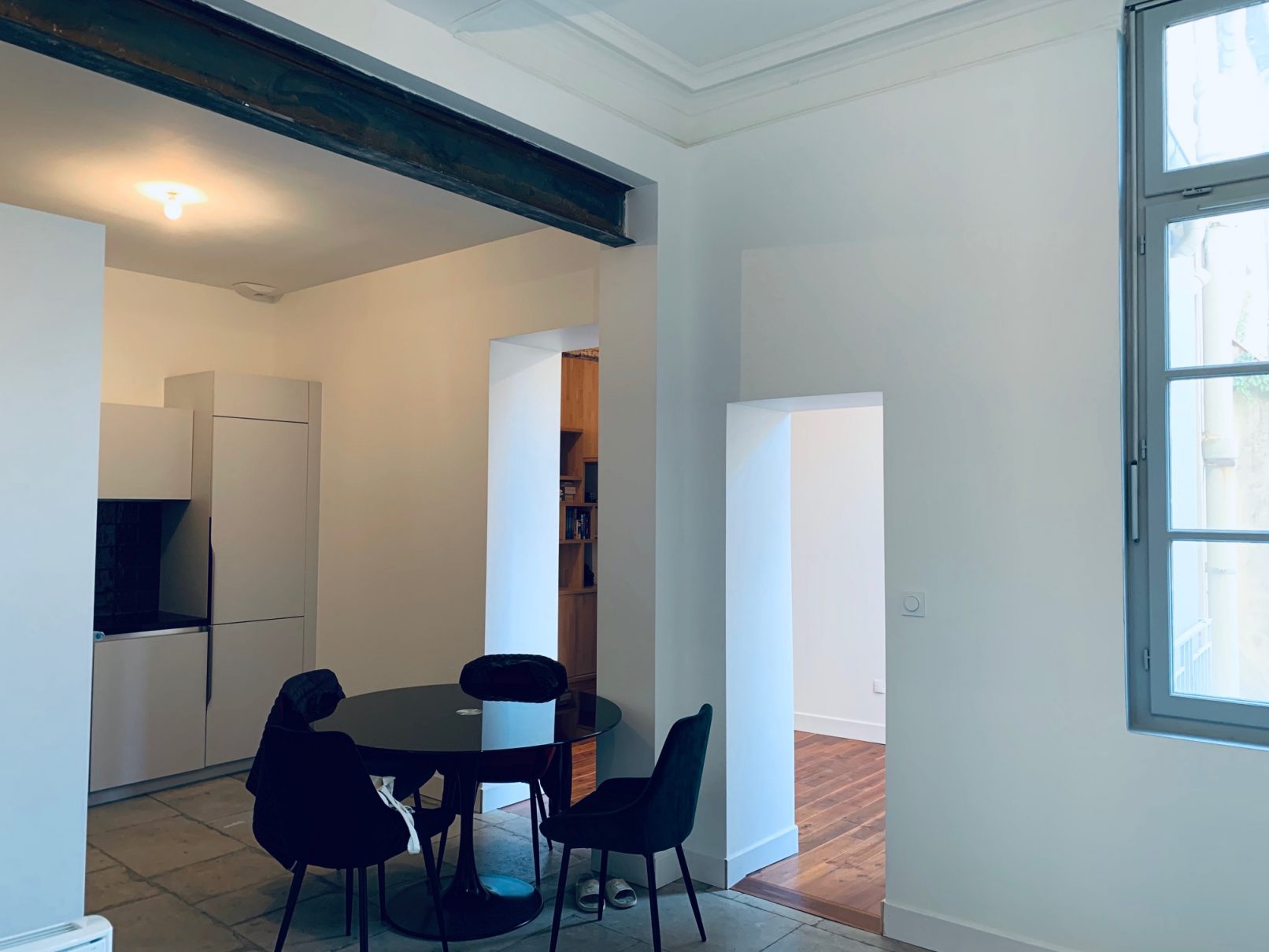 Un appartement bourgeois de 115m² en centre ville doit être réhabilité en totalité, changement des menuiseries, rénovation des bars de sol et des plafonds avec moulures, création de 2 salles de bain modernes et réalisation d’une grande ouverture en sous-oeuvre agrandissant l’espace de vie.