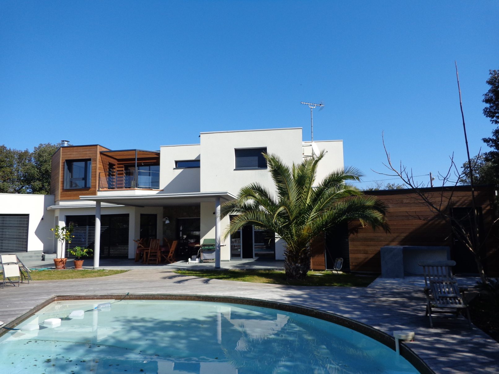 Le projet consiste à créer une surélévation bois en R+1 pour réaliser 2 chambres et une salle de bain supplémentaires ainsi qu’une terrasse abritée. En RDC à proximité de la piscine, un espace vestiaire/salle d’eau est également conçu en bois.