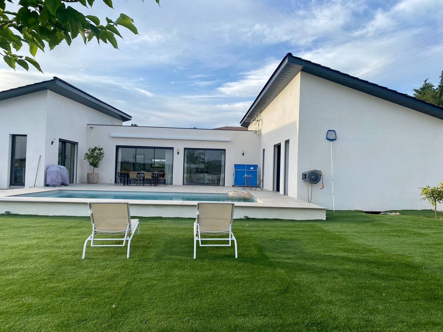 Réalisation d’une villa contemporaine de plain-pied, conçue en 3 volumes  s’imbriquant les uns dans les autres. Un traitement architectural épuré et moderne, par l’utilisation de 2 matériaux majeurs de teintes distinctes, un enduit blanc et des toitures et menuiseries en  gris anthracite.